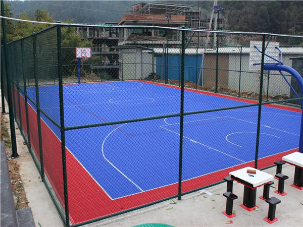 2、安裝簡單,體現它的“拼裝”性能,邊緣以鎖扣銜接,基本屬于純手工作業。工期短,一個500㎡的籃球場,包括畫線四個人一天即可施工完畢。平整水泥地即可。無保養期,安裝好即可使用。
