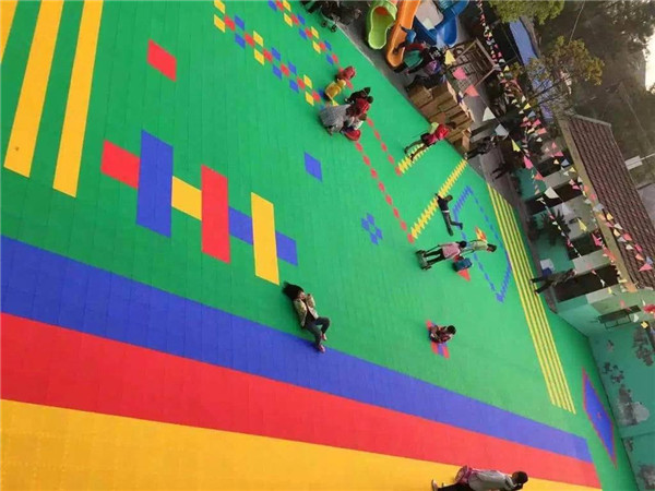 幼兒園懸浮地板在安裝的過程當中不需要使用膠水粘結,直接拼裝即可,且只需用清水沖洗即可,污水會隨著地板底部的排水口排出,不會形成淤積,清洗同時不會影響使用,打理起來十分方便。